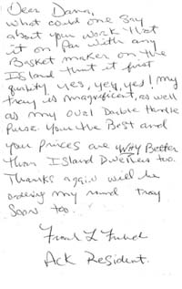 Please contact Dana by email: danabskt@yahoo.com Please allow several weeks to a couple of months for weaving. Custom scrimshaw, and carved ivory takes a minimum 4 to 6 weeks.